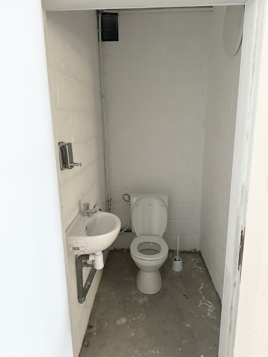 Espace 1 : entrée principale avec porte de garage, deux espaces intérieurs, WC séparé.